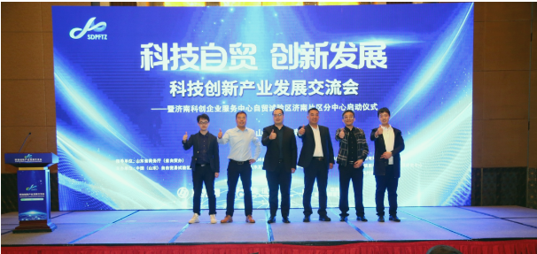 2023年10月31日,以“科技自贸、创新发展”为主题的科技创新产业发展交流会在济南喜来登酒店举行,会上自贸试验区济南片区管委会副主任陈浩、山东省科技厅合作处副处长、三级调研员王南南为山东互联网出海产业生态中心揭牌。