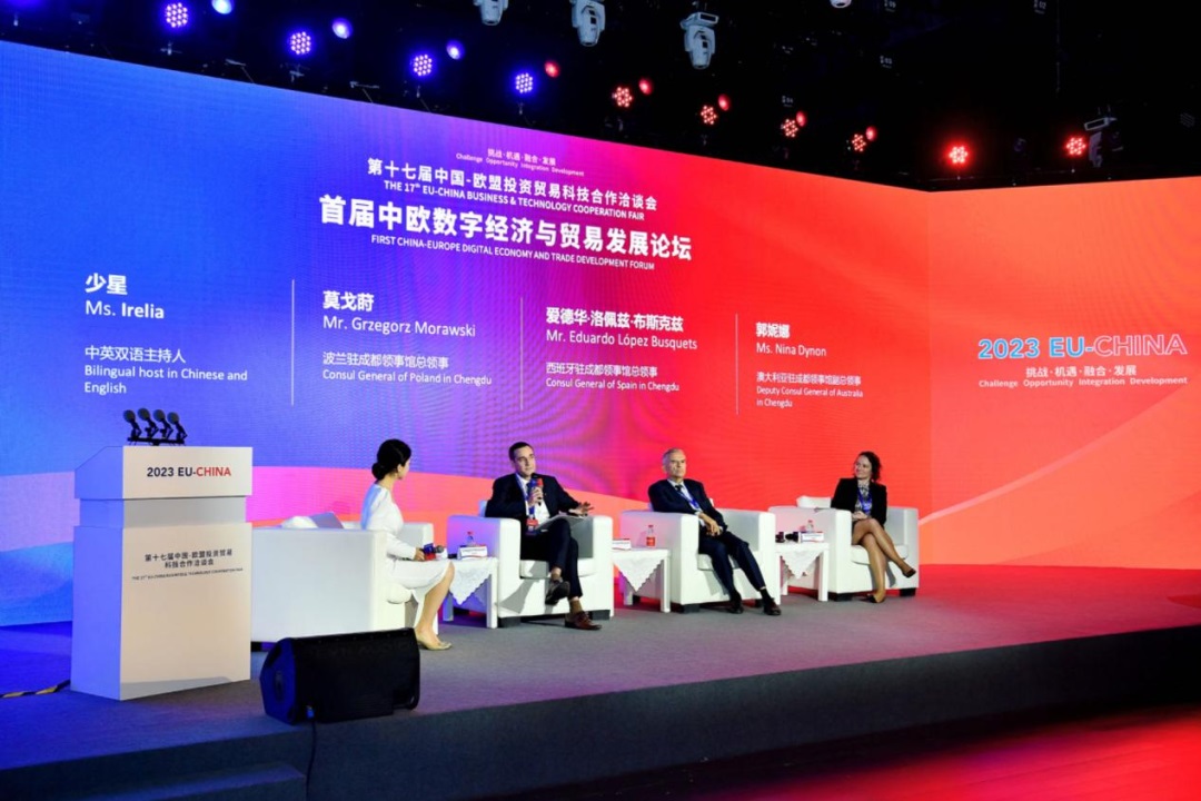 本次论坛以“紧抓西部经济发展新机遇 打造中欧贸易合作新篇章”为主题,邀请中共中央对外联络部原副部长于洪君、成都高新技术产业开发区管委会副主任陈洪涛、成都市投促局副局长张平、波兰驻成都总领事莫戈莳、西班牙驻成都总领事爱德华·洛佩兹·布斯克兹、澳大利亚驻成都副总领事郭妮娜女士、国是金融改革智库首席专家 刘胜军、中国欧盟商会西南分会总经理黄欢等出席会议,围绕西部地区数字经济发展下的中欧合作新机遇,数字时代下的国际消费城市建设,中欧贸易合作与展望,在中欧青年互学互鉴中孵化中欧合作新范式等议题展开对话交流。